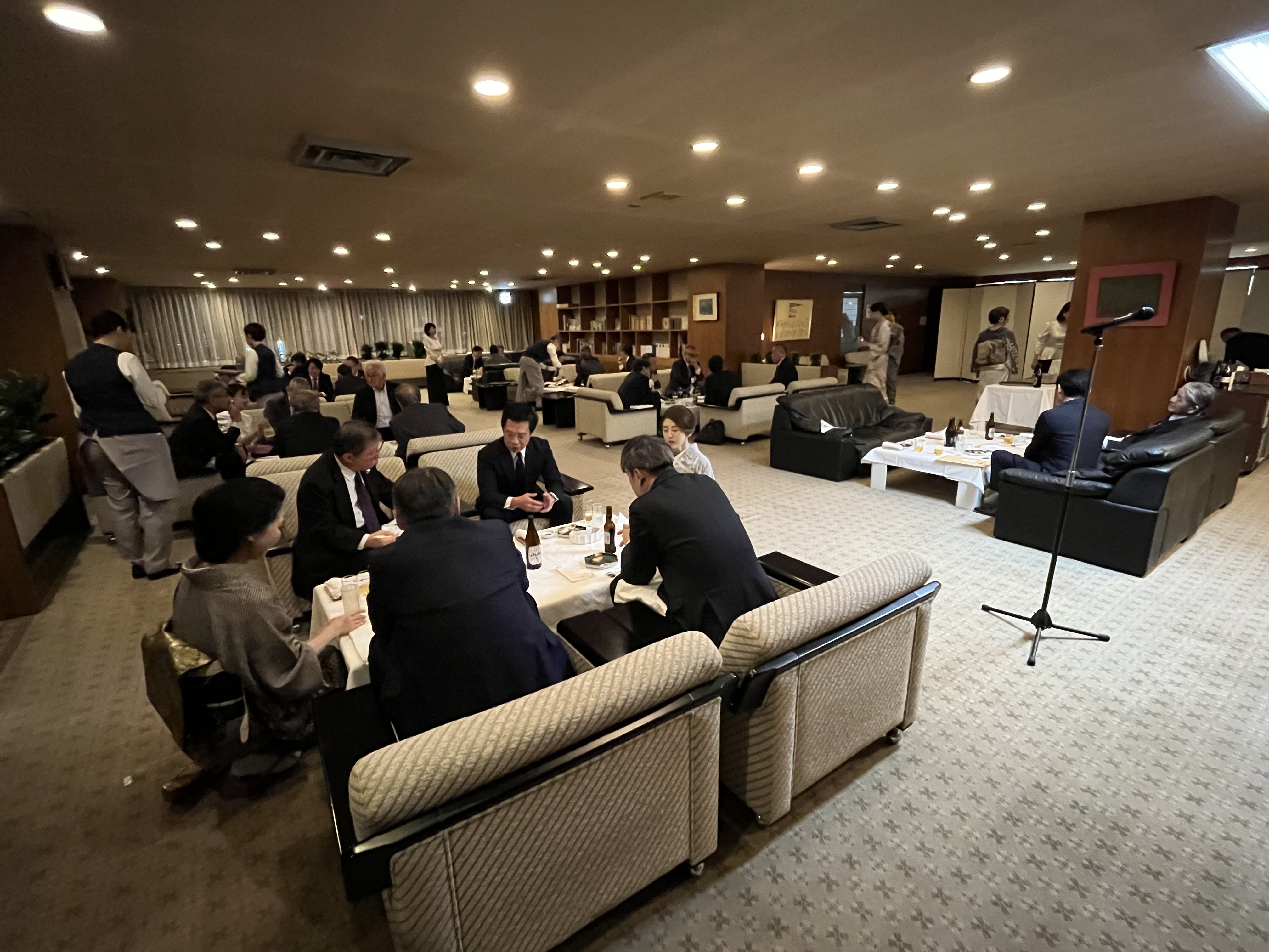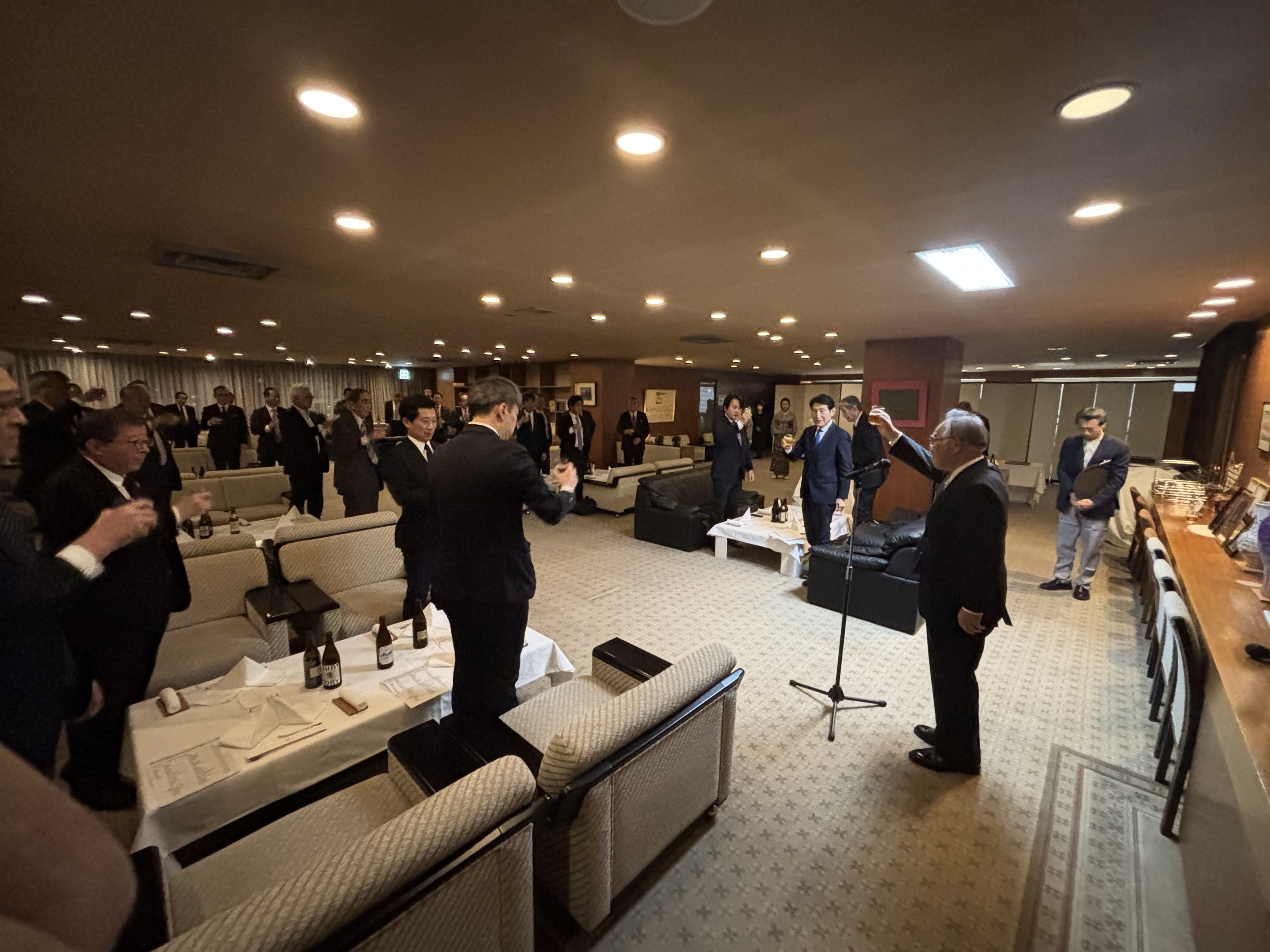 苅田知英理事長が開会のあいさつをし、椋田昌夫副理事長が乾杯の音頭を取って始まった。出席者は、ANAクラウンプラザホテル広島の料理や地元の日本酒、ウイスキーなどを味わいながら和やかに団らん。忘年会も兼ねたひと時を楽しんだ。